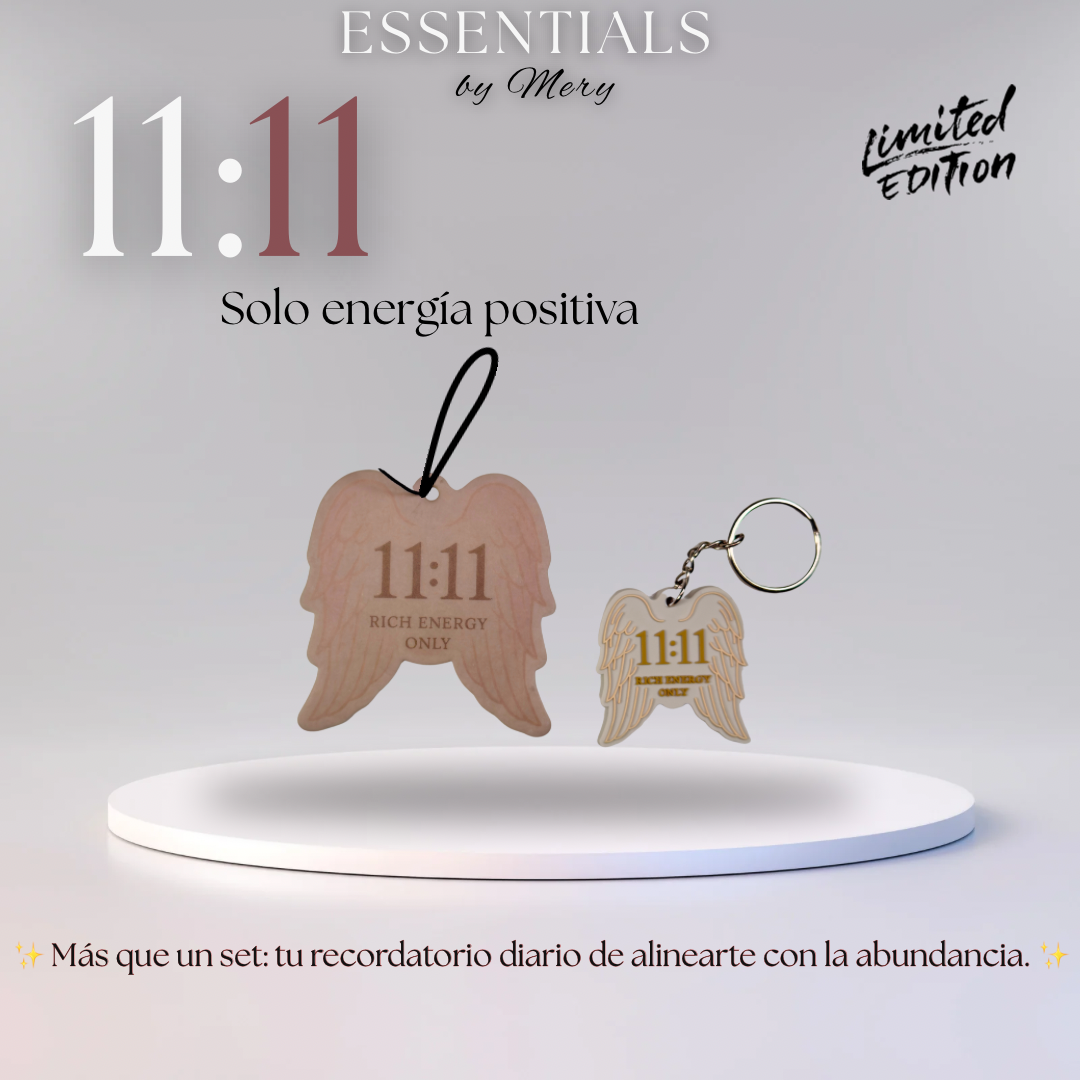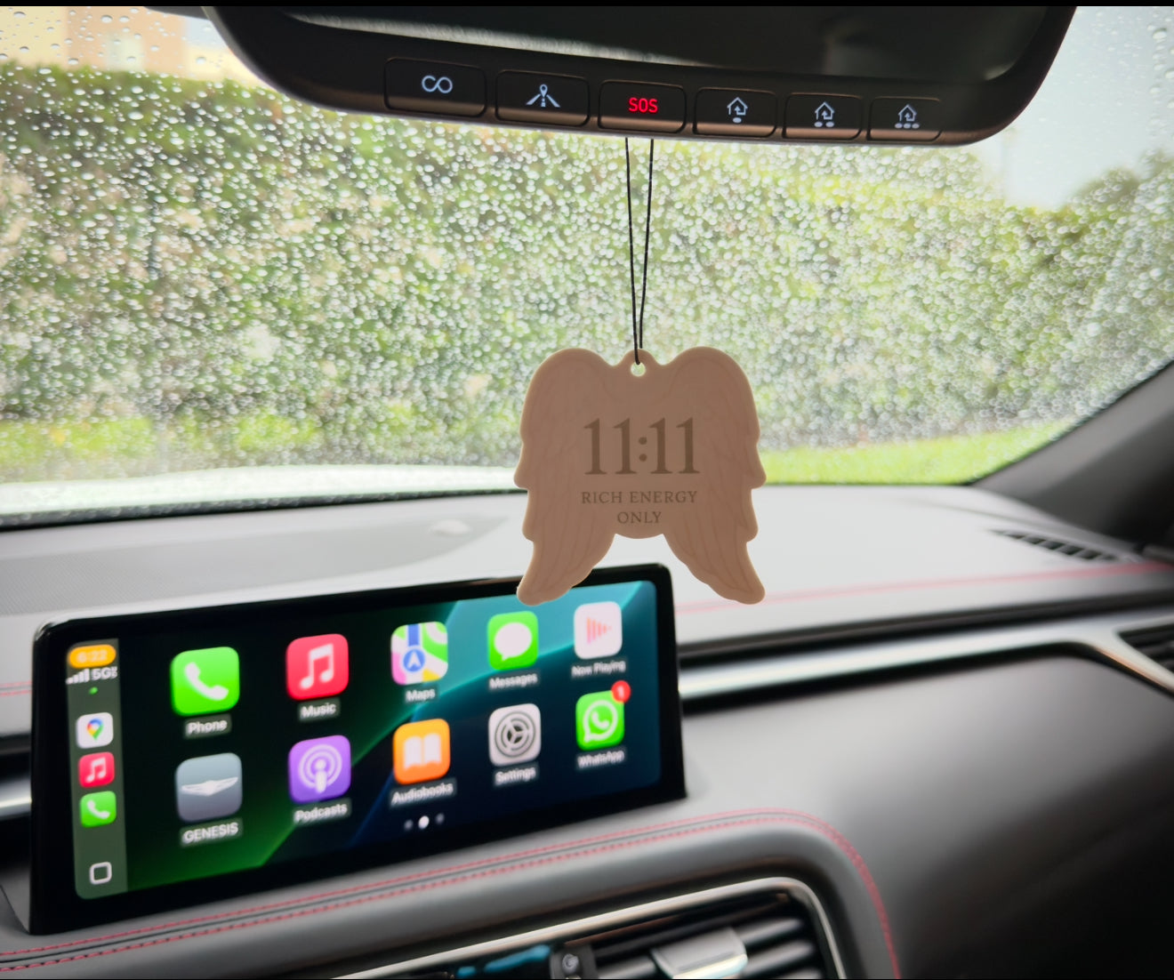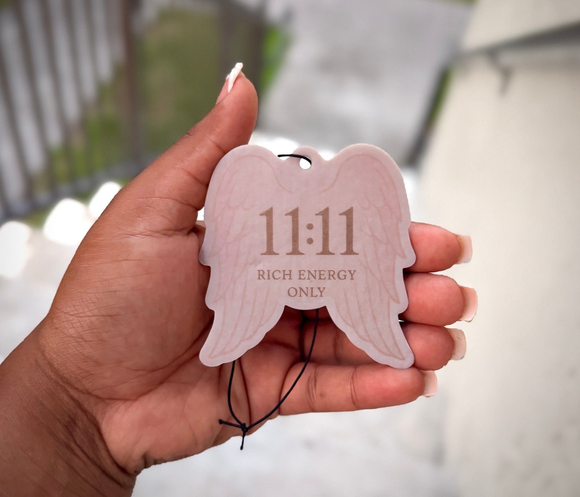 Step into luxury with the Essentials 11:11 / Rich Energy Only Bundle. Designed with angel wings and a spiritual-inspired cut, this set includes a matching air freshener and keychain — the perfect duo to keep your car smelling fresh while manifesting rich energy only.